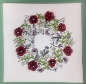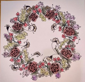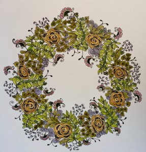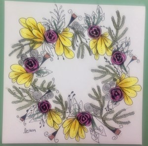 After getting our “Diva Dance…Rock n’ Roll” flowers down onto our tile, we added some greenery and then everyone went off on their own speed. The pattern list was in order of drawing so that helped! The final designs are beautiful. And, once again, very different each and every one. While we could have filled our wreaths in a little more, time didn’t allow us to do that. Hopefully, there will be a second attempt at home and more time for filler patterns. All in all, it was enjoyed by everyone, and gave us ideas that could cover all four seasons …. Autumn, Winter, Spring and Summer! These would also be great on smaller tiles to give as gifts or create greeting cards. Can’t wait to give a Christmas wreath a try!