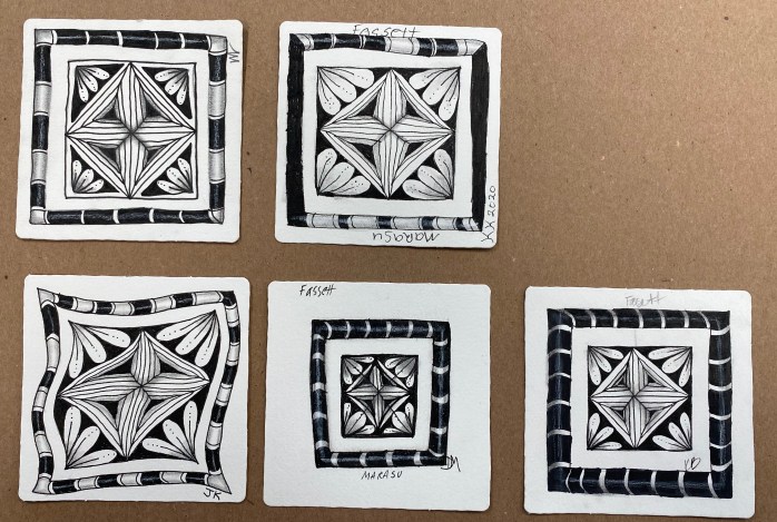 The second tile featured a “box in a box in a box” string and included the patterns Fassett, Flux and Marasu (uncoiled). For a little flair, we added a highlight around the outside Marasu frame with a while charcoal pencil. All the tiles were beautiful, and just their second! I always find it interesting how different they can be – heavy handed, lighter handed, sizes of the patterns, etc. This is what makes Zentangle so great – no rules, just beautiful outcomes.