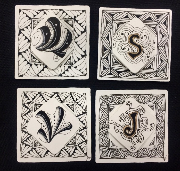 In February, a group of us met at Icarus Creative Arts Studio to learn how to make “frames” for the Bijou tiles. We took a 3.5″x3.5″ white tile and first created a border around the outside using the pattern Fassett (Lynn Meade, CZT). Then we took out a Bijou tile (2″x2″) and formed the “centerpiece” of our little ZIA. We used our initials to tangle and then fill with gold jelly roll pen. We put two slits in each side of the larger tile and stuck our Bijou inside, softly folding so they inserted and remained “puffed out” a little – more dimensional. Our second piece was a mono-tangled Bijou using the Zentangle pattern Aquafleur, with a border of Ditto (created by Sue Jacobs, CZT).