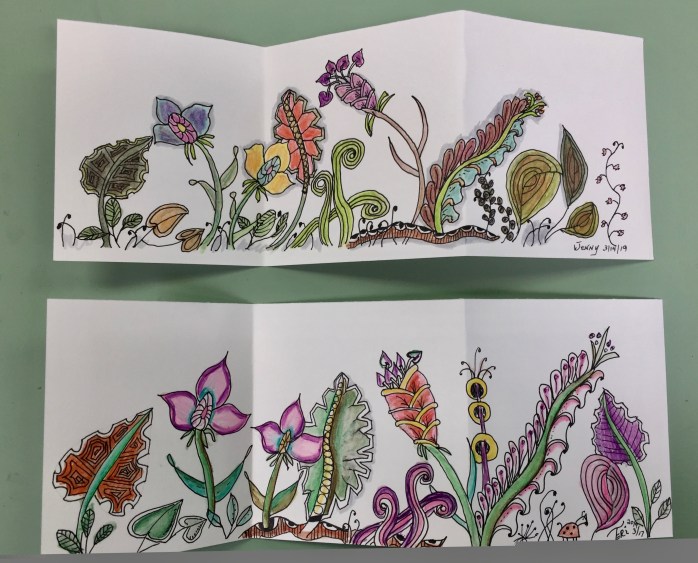 Once the drawing was complete, everyone used their favorite watercolor pencils and Tombow blending pen to add some life to the drawings. We used paper that was 4.5″ wide by 12″ long. Once all was complete, we folded our pieces into three sections so they could stand on their own for display. So much fun, and such beautiful work.