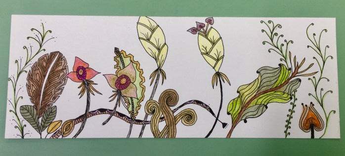 It was March 17th and the temperature was 80 degrees at the Bernardo Winery. There couldn’t have been a more beautiful, “almost Spring”, day to tangle a tropical garden. Inspired by the work of Cheryl Moote, CZT, six of us learned five new patterns and then created beautiful, colorful gardens using “Monster Leaves, Reticulated, Dragonair, Chainlea, Aura-Leaf and other floral-type patterns.