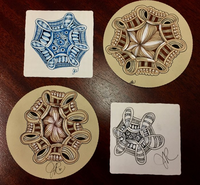 Dingsplatz can be drawn on a round or square tile, so we used one of each. Judy elected to use a blue pen, then shade with a blue pencil for her square tile. Turned out very nice. I’ve seen this technique used by others, but never tried it before. She was up for giving it a go! We did a little shading with our graphite, then added a few highlights with a white charcoal pencil. All in all, a nice evening with some fun tangling.