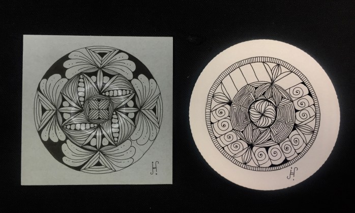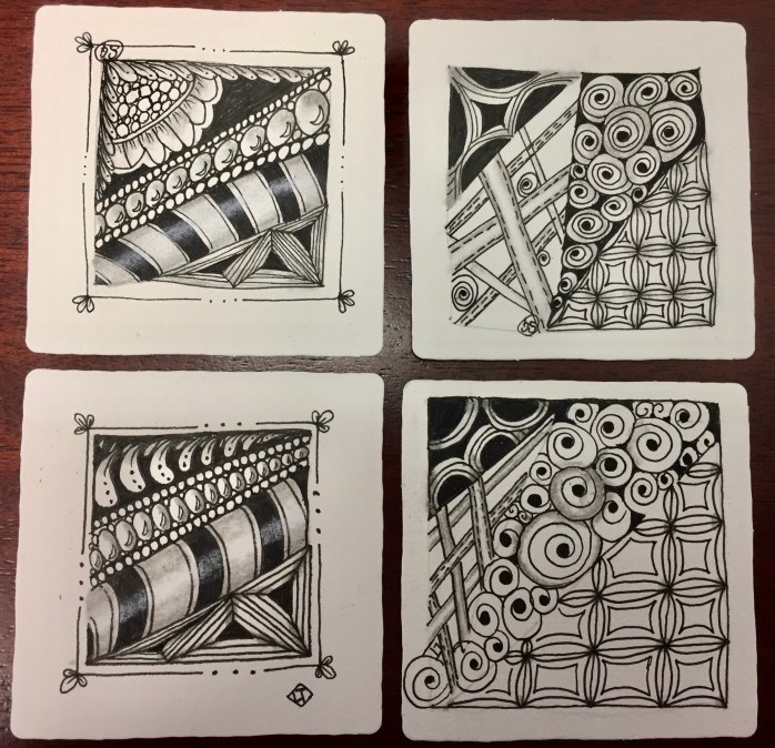 All the tiles turned out awesome. As always, I pointed out that even though we all used the same instructions and same patterns, look how different the tiles turned out. It was a really nice way to kick-off my Easter weekend sharing my passion for Zentangle with Liz and Sally. When they left ….. they signed up for my next class at the Bernardo Winery on May 19th! I’m excited to keep their Zentangle journey’s moving forward, and for them to meet the other tanglers that are a part of the Sunday classes at Icarus. Thank you Liz and Sally … see you in May!