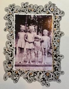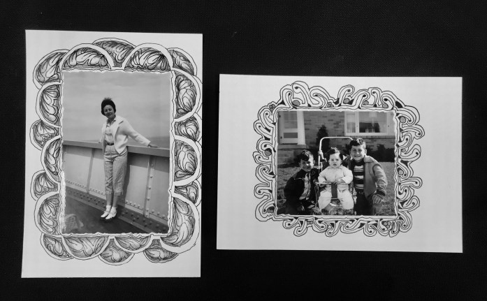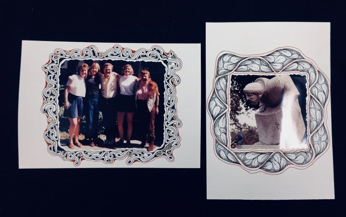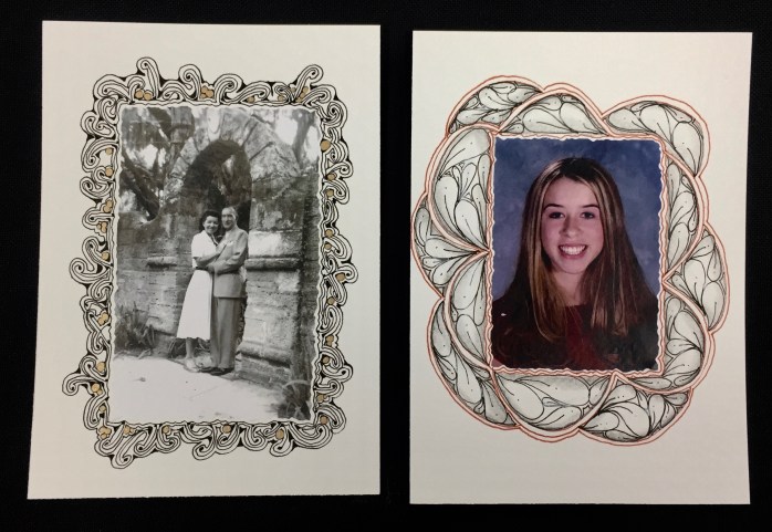 I love this technique. It forced me to look at old photos I had stashed quite some time ago, then it gave me the opportunity to use these photographs in a way that I can display and share them. I initially started by using the paper stock that came in the Project Pack, but now I’ve got a journal that I’m going to mount photos in and draw cartouches around them …. kind of a “tangled scrapbook” idea. This will keep all the pictures in one place. (Note – instead of using the original photographs, I scanned them into my computer and then printed them out on photo paper. I have siblings who might want these photos one day so I didn’t want to destroy the original copies.) Now I need to look for small keepsakes, like my Mom’s track & field medals, and create a beautiful cartouche using those …. endless possibilities.