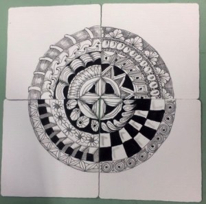 June’s class at Icarus Creative Arts focused on “Four Corners”. Each tangler had four tiles with the inner corners broken into five “rings”. We had a list of fifteen patterns to be inserted into these rings. I assigned each pattern a number and drew numbers from a basket. The number pulled was the pattern we drew at that moment. The only pattern that was drawn more than once was Fassett for the inner circle on each tile. (I made an error in counting how many patterns I had selected, so we used Fassett once more in a stripe!) There was no set stripe to insert a pattern, aside from the center. We did complete one tile at a time. It was fun at the end of class to see just how they all turned out. Pretty awesome I think!