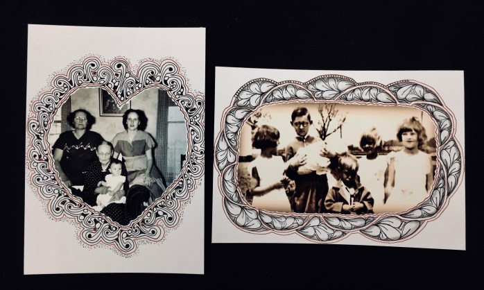 This technique was introduced by Zentangle earlier this year as part of their Project Pack Series. I have to say, it is my favorite to date! You can rediscover old treasures …. photographs, trinkets, medals, jewelry, etc. … and create beautiful pieces of tangled art to share with others. Once completed and put into frames, the old relics are brought to life and ready to be enjoyed by all over again!