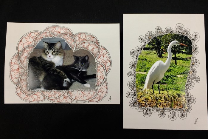 This month’s Zentangle class at the Icarus Creative Arts Studio brought ten ladies together to tangle “cartouches”. Each one brought 3-4 photos (or copies of via re-printing on computers using photo paper – saves your originals) that they were willing to cut and past onto a background. After giving each photo a trim using deckel-edged scissors, we began to tangle. Everyone was given a black micron, brown micron, graphite pencil and white charcoal pencil. Some brought their own colored pens and added color to their photos when the opportunity presented itself.