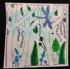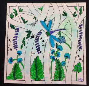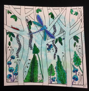 This past weekend saw eight ladies and one young man creating “tangled forests” – a class shared by Marie Browning when I attended Tangle U earlier this year. It was a fun class to create on a very warm San Diego afternoon. Everyone received a pre-colored 8×8 panel, three dual brush pens, and a dragonfly cut-out. (The pre-colored panels and dragonfly cut-outs helped save valuable class time as we only have two hours to complete our work.) A few other items made it into the packets just in case they want to give this project another try at home.