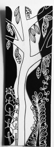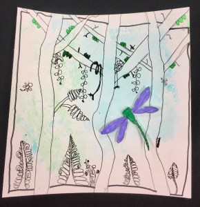 This was a fun way to create a different medium for our drawing. It’s always fun to mix up the pen colors. Just in case they really like this project and wanted to try it again – I gave Judy and Julie smaller pieces of paper (5×5) so they could create their own backgrounds, as well as a small fish template. I also shared a bookmark that I made combining the “Tangled Forest” idea, that we’d done in the past, with the black and white theme. Again, very fun … something different.