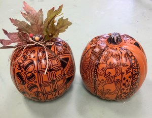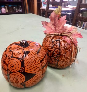 This is a very belated post from the October “Faux Pumpkin” classes – one held at Icarus Creative Arts Studio and the other at Seapoint Properties. Everyone got a small “faux pumpkin”, along with an Identipen. We used the nature-created lines of the pumpkins for our strings and tangled within each one. All in all, about 11 patterns were attempted during the class. It was a lot to finish, but we just about did.