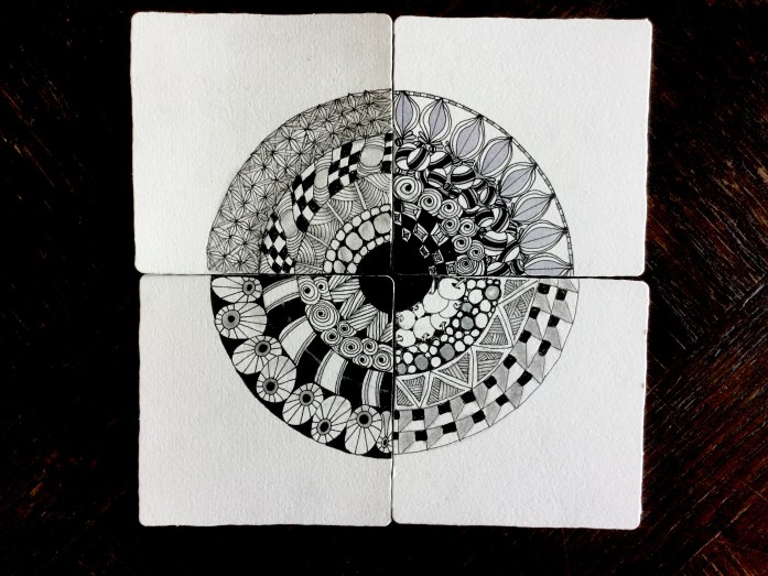 One of them featured “Co-op Tangling”. We had six people in the class so we created a string on our tile with six spaces. We proceeded to fill in one of the sections with a pattern of our choice, then passed the tile to the person next to us. They then filled in a section with their pattern of choice and so on and so on, until the tile was full.
