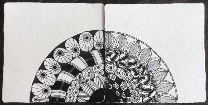 Back to the Challenge! Today I was getting together with my friend, and fellow CZT, Janet Masey, for a Monday morning tangle session. We both had read the Diva Challenge before meeting up, and decided to give it a go as a co-op challenge. We took four tiles, drew out our circles and then tangled two tiles each. Our circles didn’t extend far enough to almost fill the tile, but in the limited time we had, it worked out just fine. Consider this a dessert plate.