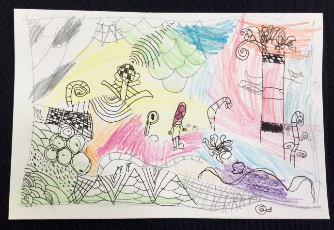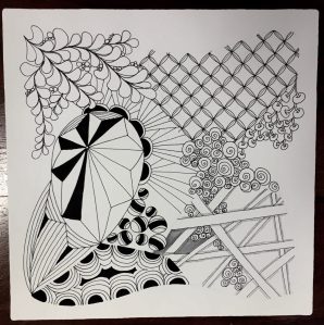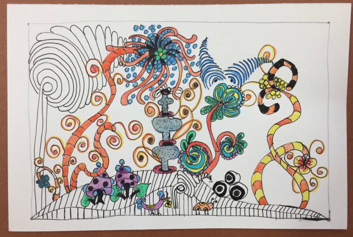 I presented a few new patterns to the group, then we proceeded to create our over-sized ZIA’s. The class included Judy Jankauski, CZT, and her daughter and 7 yr. old grandson. He was adorable! He’s been learning Zentangle from “Nana”, and even presented drawing a tile as part of his school’s “Talent Show!” He went up, drew his four dots, border lines, string and proceeded to tangle. No speaking, just drawing! How awesome is that. I should have asked him to arrive a bit earlier and he could have presented his “talent” to the rest of us. It was a real pleasure to have him in this class. He was absorbed for the full two hours, and drew a very playful garden, complete with a garden gnome (all of his own creation!)