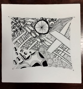 It was interesting to see the patterns that were chosen, and the different skill levels, all coming together to create a beautiful piece of Zentangle art! The students were a little hesitant about sharing their work on another’s tile, but in the end, it turned out to be a very fun project – we’re all at different levels in our Zentangle journey’s, but we all started from the same place!