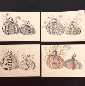 Had another great class last weekend at Icarus Creative Arts Studio on the grounds of the Bernardo Winery. Our topic was Autumn so we tangled … what else … pumpkins! Twelve different patterns – some new and some old – adorned our 5×7 ZIA’S. Everyone did a great job and really enjoyed the process of creating these little pieces of art.