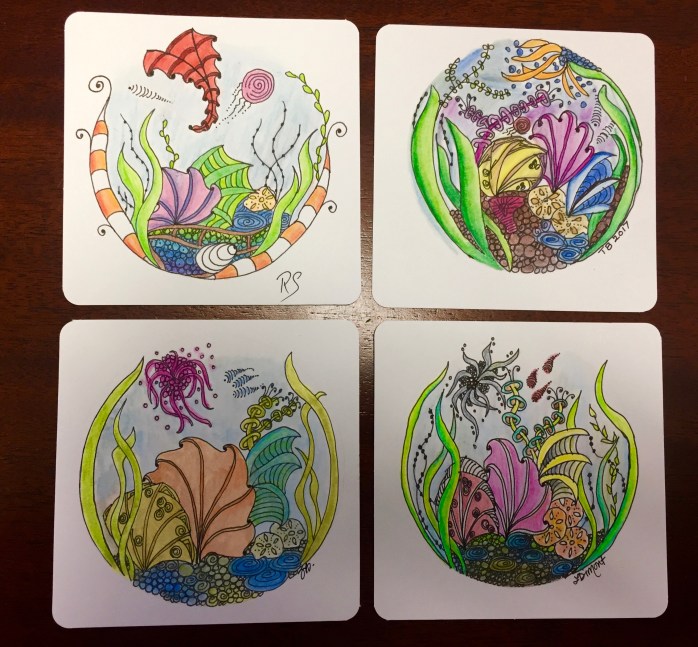 After learning a few new patterns (Angelfish, Squid, Sixty, Phycops, Btl-Joos), we agreed on using a circle on an Apprentice tile as our foundation. This gave us a little more room than the regular 3.5×3.5 tile. After we got our basic patterns down, everyone was on their own to embellish the patterns/tile as they wished. Then … out came the watercolor pencils. We had a great time filling in our “aquariums” and blending the colors with a Tombow Blending pen.