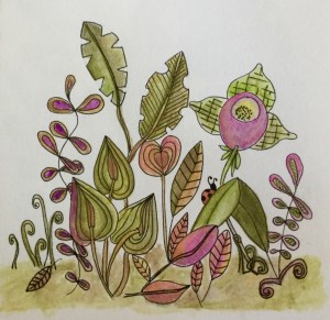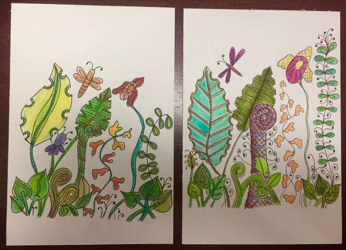 Last night I shared Cheryl Moote’s “Tropical Garden” ideas with Judy and Julie. These two love everything that has color so our meetings are usually ZIA-based projects. In order to finish in our two hour time frame, we created our gardens on 5×7 paper. Once they were happy with their designs, we used Derwent Inktense watercolor pencils to add the color. These definitely turned out really nice, and look how different the two are, even though we used the same basic patterns.