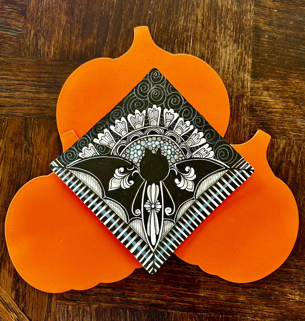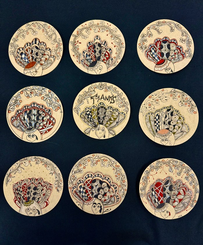With Thanksgiving just ahead, a little whimsy was called for … in the shape of a turkey! We drew our turkeys on Renaissance zendalas using black and different autumn colored inks. The completed tiles were shaded with graphite, white chalk pencils and then the addition of a colorful jelly roll sparkle pen and a clear glitter pen. They turned out great! The group consisted of regulars and three new tanglers – and I think every tile is awesome.