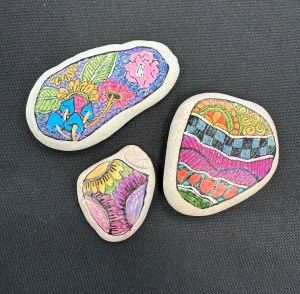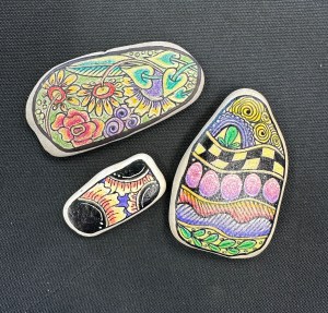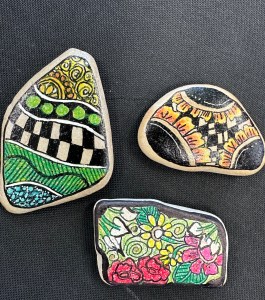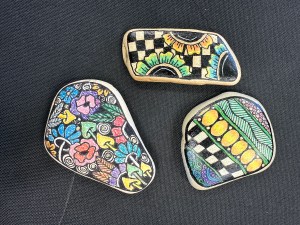 After sharing a couple with my last class, they were eager to give “rock tangling” a go. Last Sunday found eight of us drawing multiple Zentangle patterns, using black Identipens, adding color using colored pencils, and then embellishing with white and gold Jelly Roll pens. Once all the ink was completely dry, a light coat of ModPodge was painted over the artwork. The final results were three beautiful rocks per tangler, and additional blank ones in their packets to tangle at home.