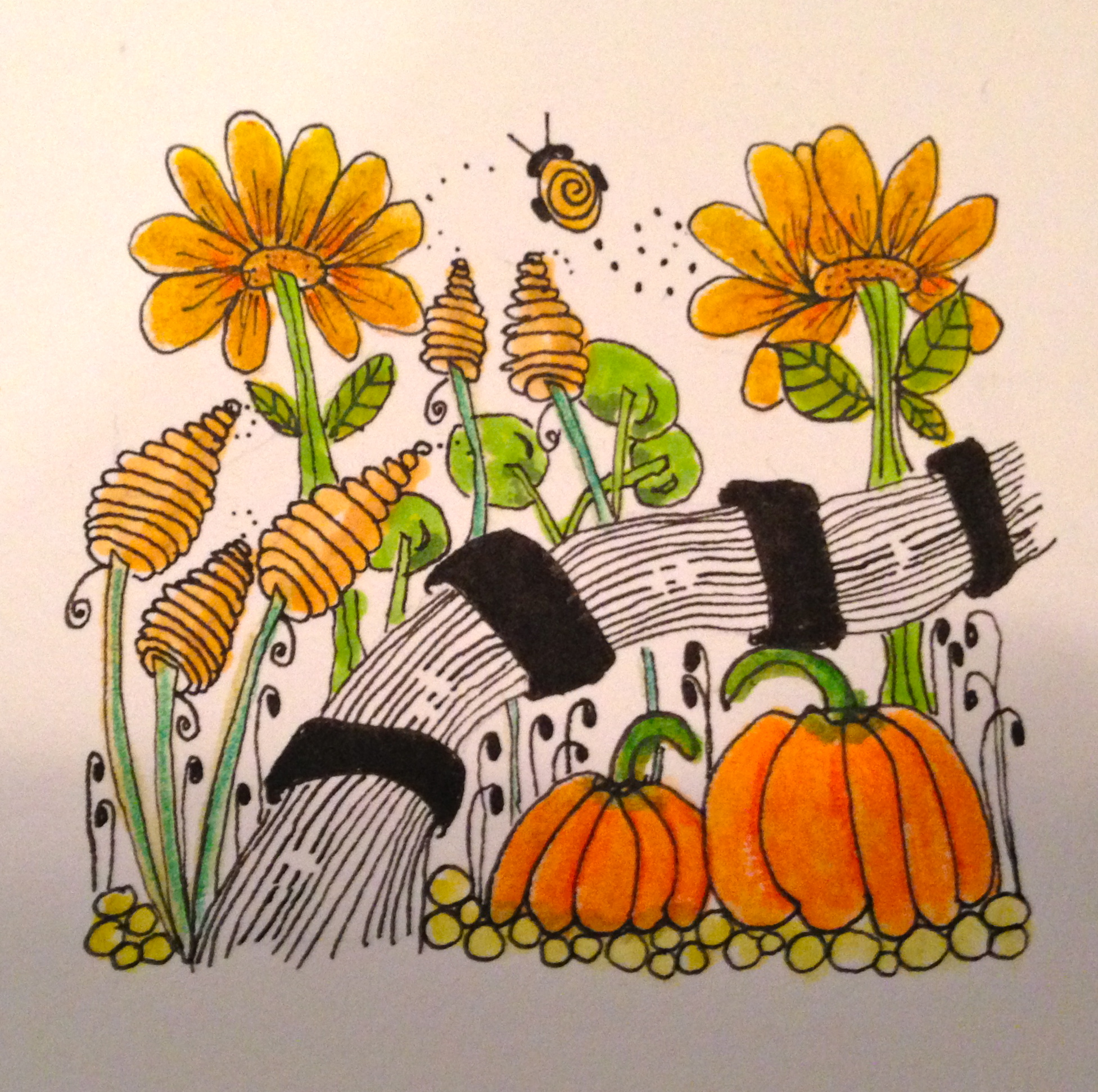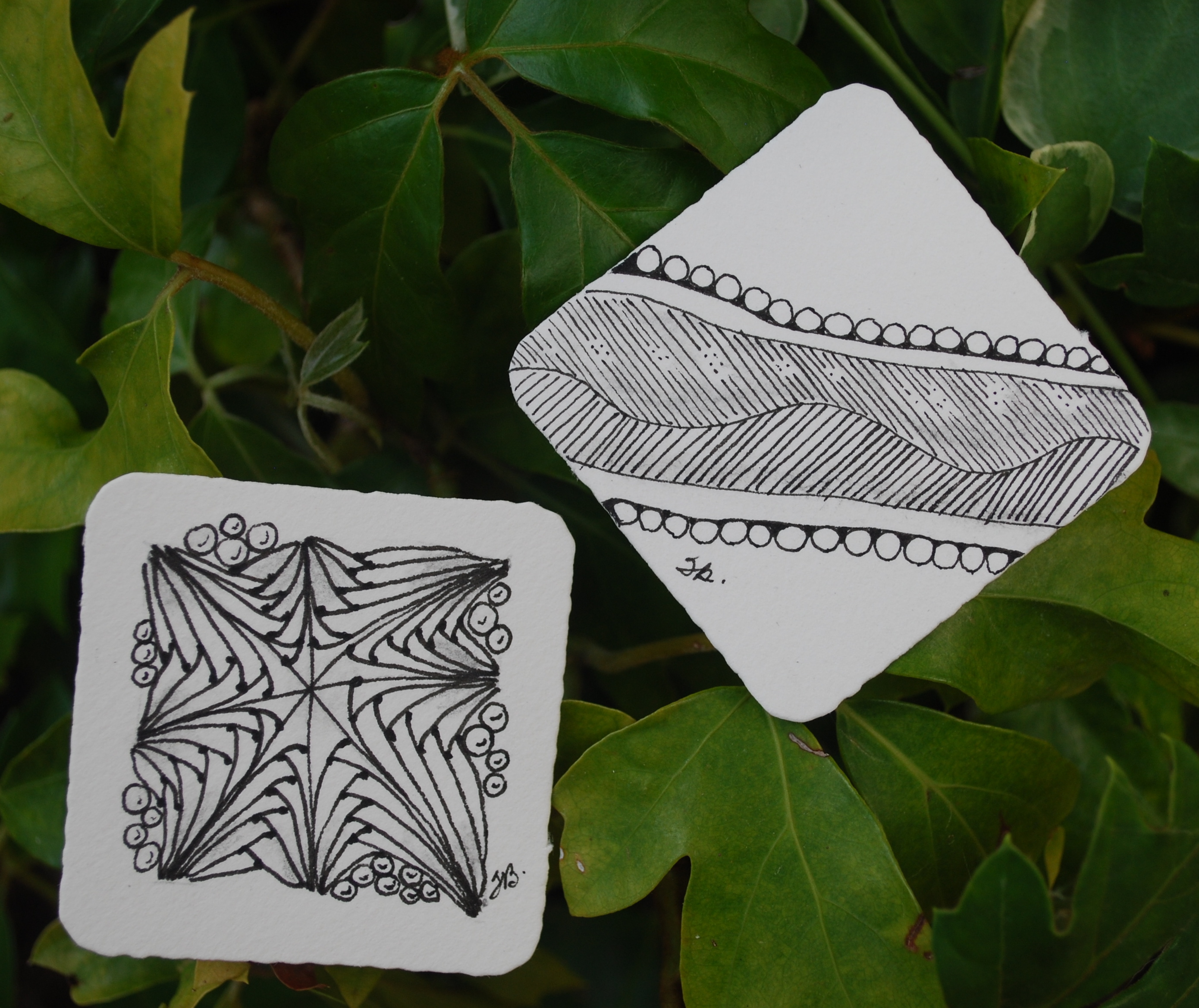 While I knew I wanted to participate and support my fellow CZT 14 friend, I’m sad to say I don’t own any stencils, but I did have a mini spray bottle! I collected a couple leaves from the yard then used some chai tea and coffee to make my string. The fluids weren’t dark enough to do much damage, but the leaves did show quite nicely so I chose to fill them in. Not my best but I tried several times to color the tile and it just wasn’t working for me. And, on second thought, I think I should have tangled around the stencils and maybe things would have shown up clearer. Anyway, I did learn something from this challenge …. I need some real stencils! Charlotte … any in the store? … a must purchase on my next visit to Charkat’s Creative Insanity!