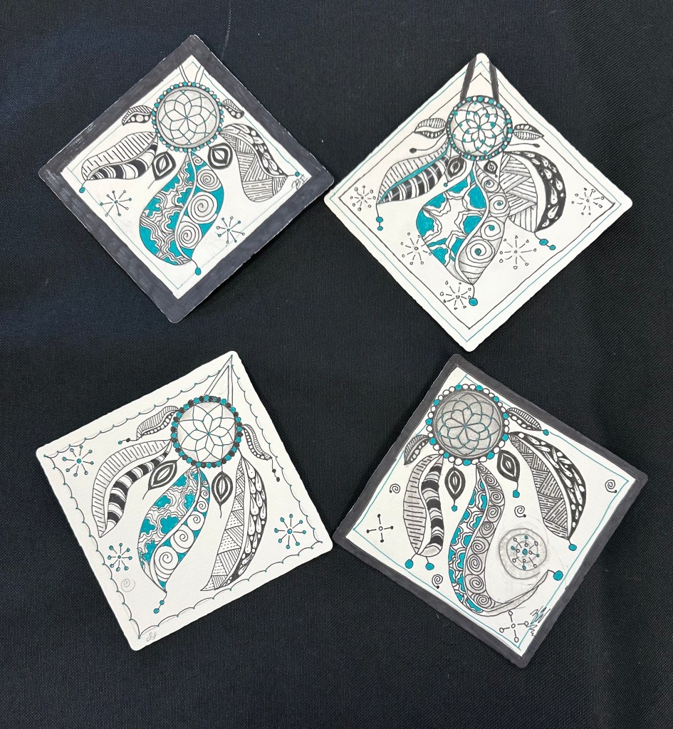 Ten of us gathered last Sunday at Icarus to create Zentangle Inspired “Dreamcatchers”. Supplies used were the new “5xPhive” white tiles, Sakura gelly roll pens in turquoise and white chalk pens, along with the standard pencils, and tortillion.