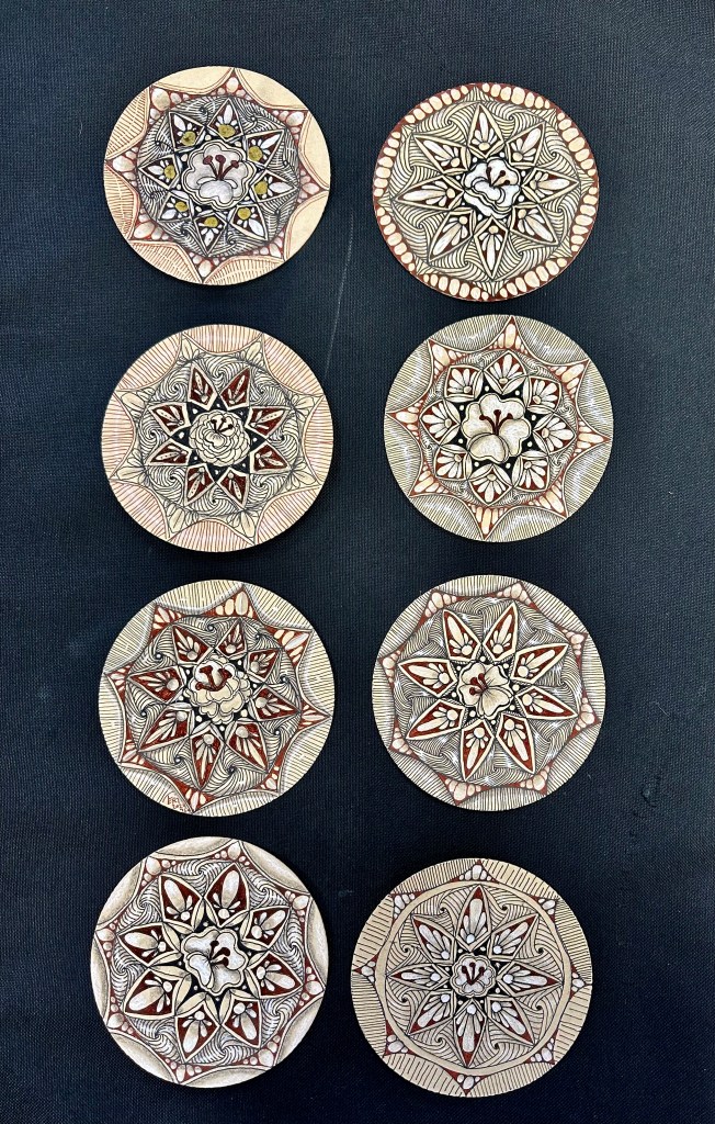 The July class at Icarus featured Renaissance Zendala tiles with black and brown ink. Highlights were added with graphite and white chalk pencils. I introduced the Markus Operandus tool, which was used in creating the 8-point “petals” of the Zendala. The rest of the Zendala “string” was created freehand off of the original 8 points. These look so complicated when complete, but are actually quite easy to create and addicting!