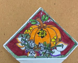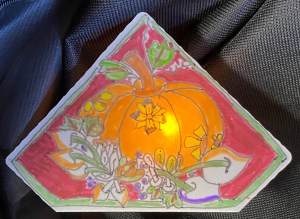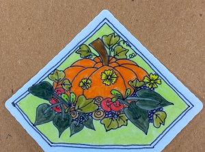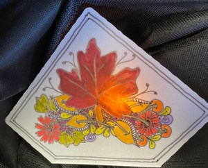 This past Sunday, four of us made “Fall Lanterns” using the new Zentangle “Translucen-Z” tiles. We managed to finish two each, a pumpkin and a leaf, added some color and lit a battery-operated candle behind them! Turned out super cool. These translucent tiles could provide many backdrops for many occasions.