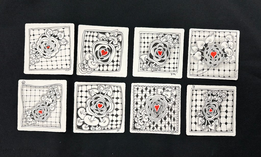 Patterns used were Zentangle patterns Pangea/Mrth and a variation of Onamato, as well as Pouf and Barberpole by Suzanne McNeil. These four patterns were great shading patterns. Everyone did a great job, including Dee and Marnie, the first time tanglers, who look like seasoned tangling pros.