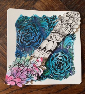 Took a virtual class from Sam Taylor (www.facebook.com/zenlapse) this afternoon. So much fun! Even met someone from my little hometown (population 7500) of Trail, BC, Canada in the class. Sam does alot of marine life ZIA’s, sometimes mixing watercolor and tangles. The fish drawn today was black and white. I will definitely return to “Sam’s classroom”.