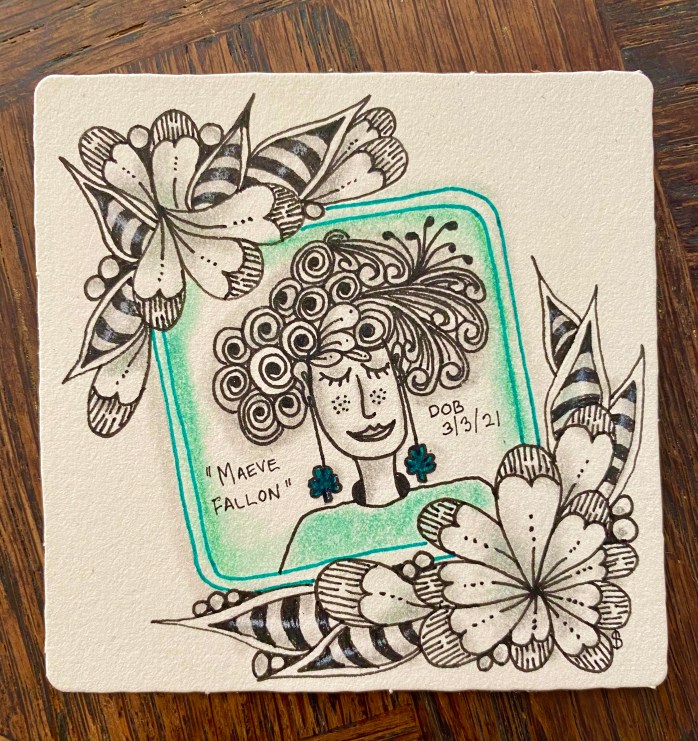 Since I enjoyed both of the projects described above, I decided to incorporate them into one tile. You can see my floral borders in the top and bottom corners, and then my Bijou tile with my Irish lassie. I should point out that Katrina came up with assigning dates of birth to the people (using the date you draw the tile) and then giving them names. This is fun in itself! I introduce you to Maeve Fallon!